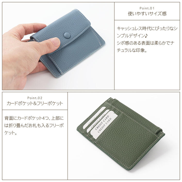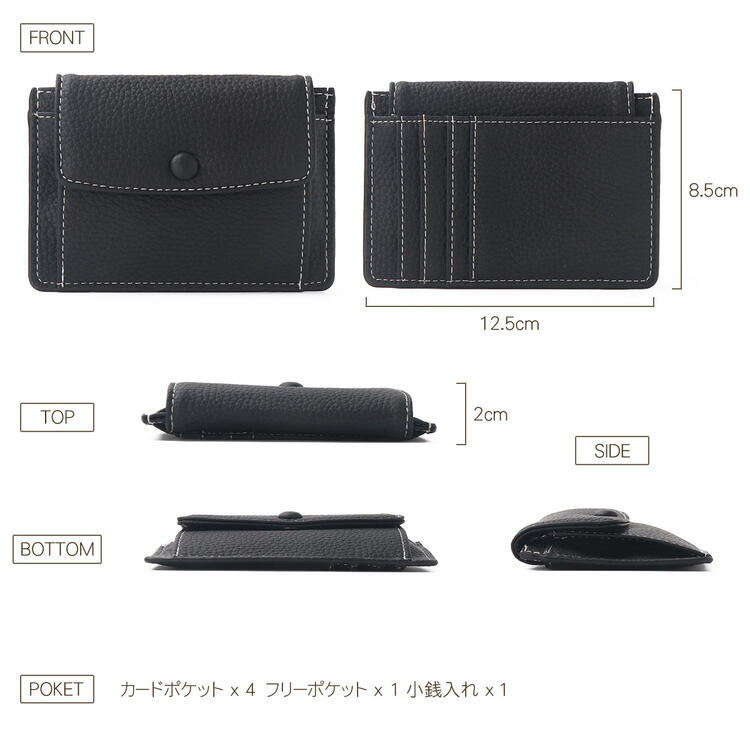 サイズ(最大部を計測) 縦幅約8.5cm 横幅約12.5cm 厚み約2cm 商品詳細 素材合成皮革 留め具スナップボタン 内側収納無し 外側収納フリーポケット×1、カードポケット×4、小銭入れ×1 備考※商品写真は実物のカラーにより近づけるために加工してありますが、お客様のご覧になる機種・設定により実際の商品と画像の色が異なって見える事があります。