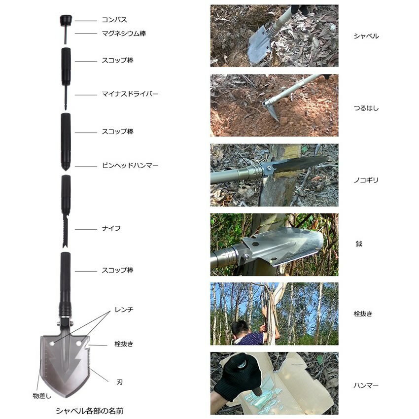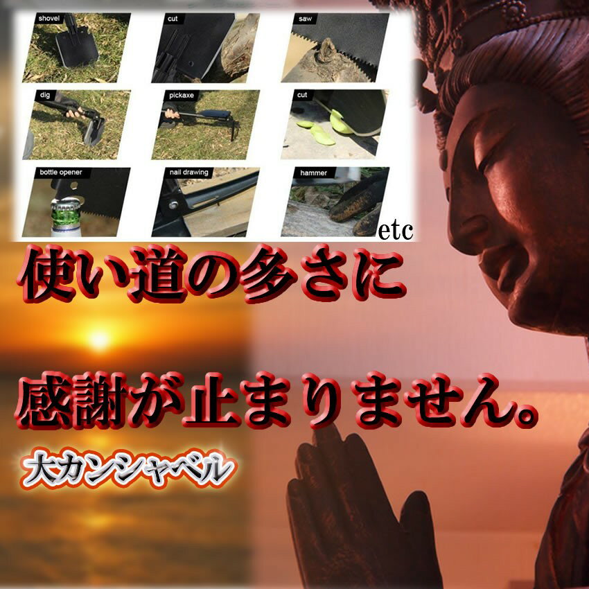■商品説明■ 【大カンシャベル -大感謝ベル- 】多機能シャベルの登場です!かっこいいだけでなく、ナイフやコンパス、ドライバー、マグネシウム点火、鋸(鋸)、鍬(くわ)、栓抜き、ガラス割り様々な用途に合わせたシャベル多機能すぎて覚えられない!?アウトドアの神様です。