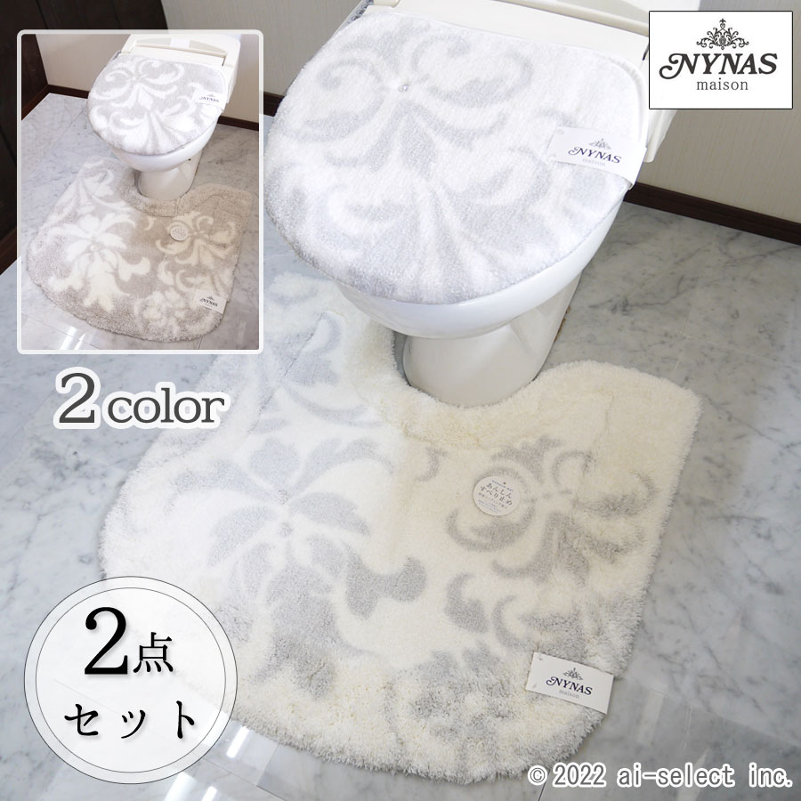 New トイレマット & フタカバー 2点セット 吸着式 ほとんどの洗浄暖房用便座に対応 マルチフタカバー グラン 光沢糸 高級感 上品 アラベスク模様 日本製 グレージュ or アイボリー おしゃれ 可愛い ゴージャス