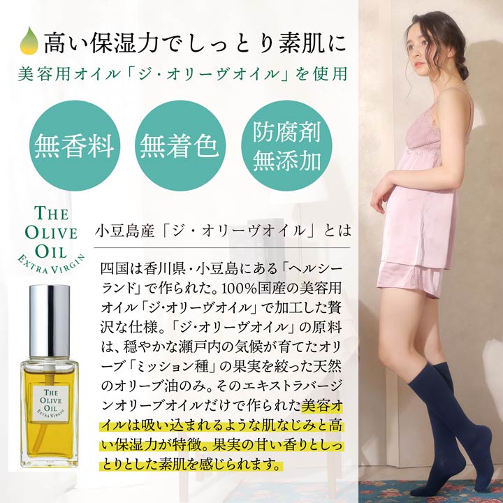 【商品説明】 小豆島産の美容専用オリーブオイルを織り込んだ、素肌に優しい素材で作られた美容デイソックス。
