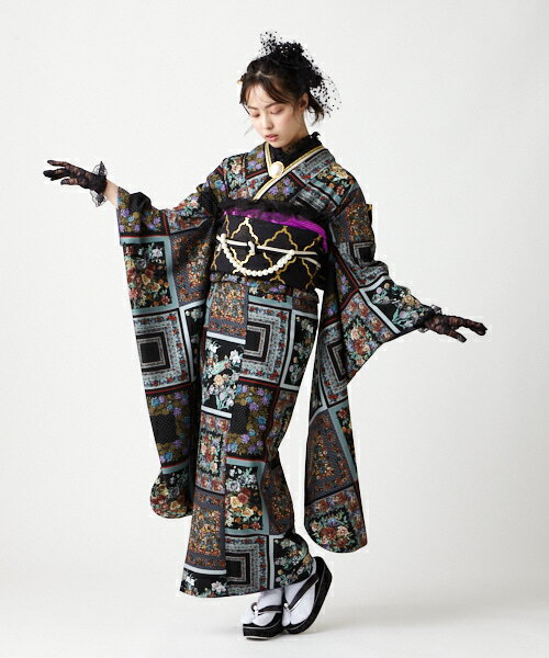 振袖のアンティークなデザインを活かして黒のフリルやレースでコーディネート。