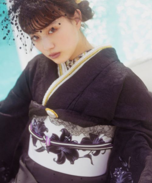 振袖+袋帯+小物 14点セット 鶴嶋乃愛さん着用セット公式 ふりふ 振袖 小物 セット レトロ 大正ロマンきもの 成人式 卒業式 パーティー 2次会 仕立て上がり プレタ フリーサイズ レトロ モダン 和色 洋風 個性派 シンプル 花柄 百合 古典 個性派 黒 ブラック