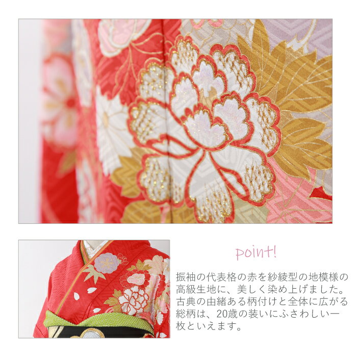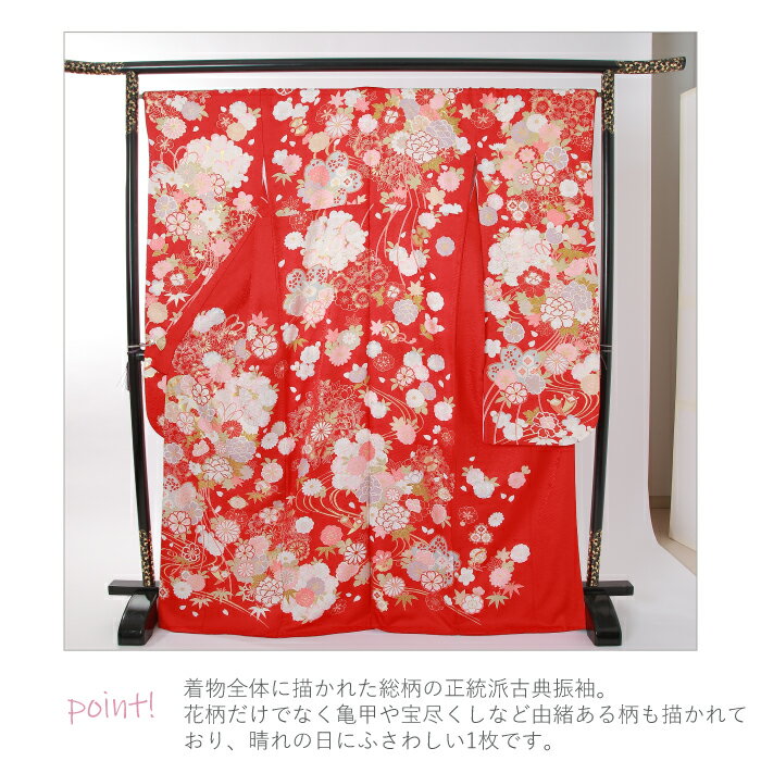 商品情報 品番 3-11-10626bサイズ 身長:152cm〜162cmヒップ:86-95推奨身丈:162cm裄:65.5cm袖丈:104cm 前幅:24cm後巾:29.5cm素材 振袖表地:正絹裏地:合成繊維胴襦袢:合成繊維注意点 ・本品は当店でレンタル振袖として使っている商品の処分販売となりますので、多少の使用感がございますのでご了承くださいませ。