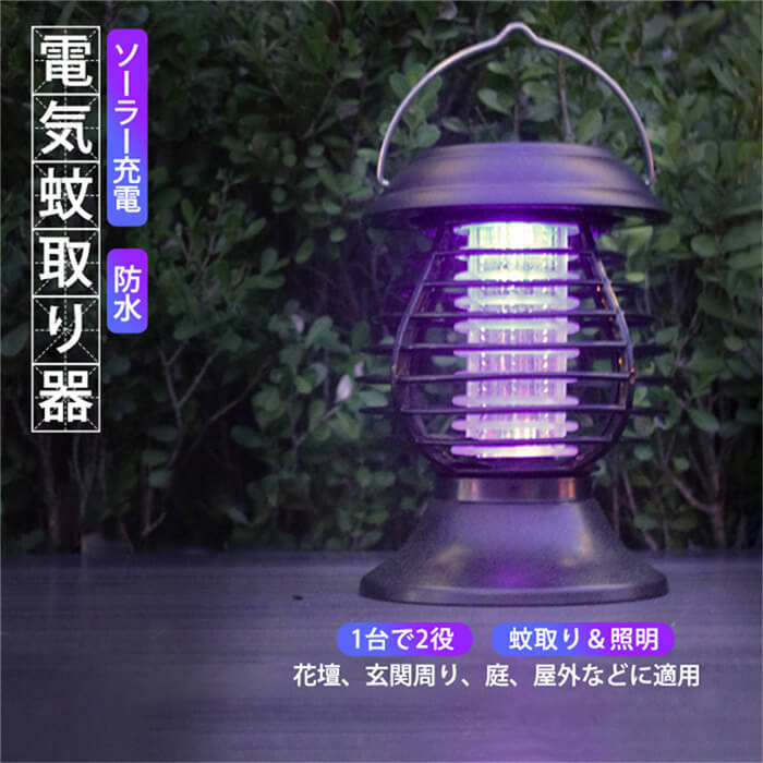 ★電撃殺虫器 蚊取り UV光源誘引式 殺虫灯 ソーラー充電式 LEDソーラーランタン ガーデンライト 照明と蚊取り両方使用できます 置く/吊り下げる/地面に挿す可能 防水 薬剤不要 屋外/庭/園芸/玄関/アウトドアなどに適用