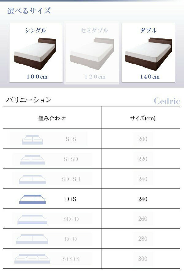 商品名連結ベッド 幅240 ワイド 2人 3人 4人 家族 つなげる 2台 連結 分割 ファミリー 親子 マットレス付き チェストベッド ミドル ベッド下収納 引き出し付き 大容量 ローベッド ロータイプ フロア 低床 低い 宮付き ヘッドボード 枕元 棚 ラック 携帯置き ティッシュ置き メガネ置き リモコン 頭上 収納 コンセント ゲーム ケーブル スマホ 充電 電気 デザイナーズ ホテル モダン 高級 メンズ商品バリエーション国産カバーポケットコイルマットレス付き 幅250(S+D)全バリエーション商品説明●ベッドフレーム●【サイズ】ウォルナットブラウン長さ215cm、高さ71cm共通シングル :幅103cmセミダブル:幅123cmダブル :幅143cmWK200(S×2):幅206cmWK220(S+SD):幅226cmWK240(S+D):幅246cmWK240(SD×2):幅246cmWK260(SD+D):幅266cmWK280(D×2):286cmWK300(S+S+S):309cm引出し有効内寸:幅93×奥行き44.5cm×高さ10cm(実寸8cm)長さ212cm、高さ70cm共通シングル :幅101cmセミダブル:幅123cmダブル :幅143cmWK200(S×2):幅202cmWK220(S+SD):幅224cmWK240(S+D):幅244cmWK240(SD×2):幅246cmWK260(SD+D):幅266cmWK280(D×2):286cmWK300(S+S+S):303cm床面までの高さ:26cm引出し有効内寸:幅92×奥行き43×高さ10cm(実寸8cm)【材質】合成樹脂化粧繊維板(ヘッドボード、サイドフレーム、フットボード)【カラー】ウォルナットブラウン、【重量】シングル:約50kg/セミダブル:約56kg/ダブル:約66kg/【生産国】ベトナム・中国梱包サイズ【梱包サイズ・梱包重量】ウォルナットブラウンシングル:(約)115x31x14cm/19kg、104x 53x11cm/24kg、107x43x12cm/21kgセミダブル:(約)135x31x14cm/24kg、123x53x11cm/24kg、107x43x12cm/24kgダブル:(約)155x31x14cm/24kg、143x53x11cm/24kg、107x43x12cm/29kgシングル :(約)38×104×10cm/19kg、30×109×11cm/17kg、50×105×11cm/16kgセミダブル:(約)38×126×10cm/22kg、30×109×11cm/17kg、50×121×11cm/18kgダブル :(約)38×146×13cm/30kg、30×109×11cm/17kg、50×143×11cm/20kg※各サイズ・重量は概算になります。