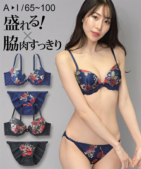 ブラジャー ショーツ セット 大きいサイズ レディース アンティーク風 フラワー プリント × マット サテン ネイビー/ブラック A85_LL〜D100_5L ニッセン nissen