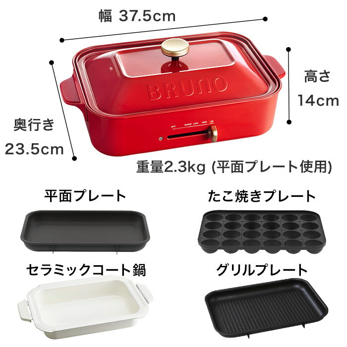 Detail 詳細 Color Size サイズ 本体: 約 幅37.5×奥行23.5×高さ14cm 平面プレート: 約 幅30×奥行20.4×高さ3.5cm たこ焼きプレート: 約 幅30×奥行20.4×高さ3cm セラミックコート鍋: 約 幅38.6×奥行24.4×高さ7cm グリルプレート: 約 幅30×奥行20.5×高さ3.5cm 電気コード長さ: 約180cm 重量 約2.1kg(平面プレート・フタ使用時) 材質 本体・フタ: スチール・フェノール樹脂等 プレート: アルミダイキャスト(内側表面セラミックコーティング) 安全装置 サーモスタット、温度ヒューズ(240度)、電源コードマグネット式 定格電源 AC100V 50/60Hz 消費電力 1200W 製造国 中国 備考 付属品:木べら/電源コード ※パッケージは予告なく変更となる場合がございます。