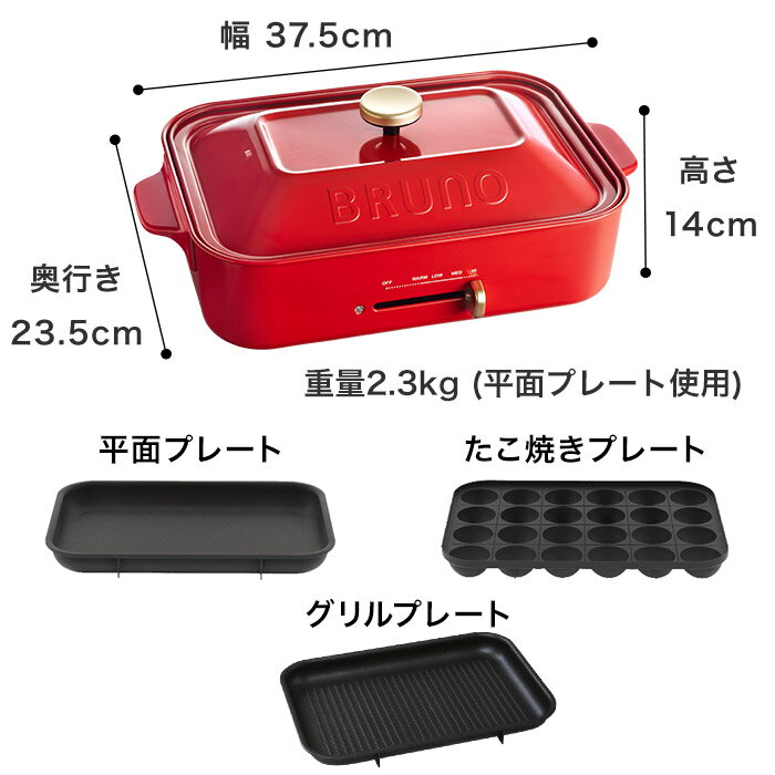 Detail 詳細 Color Size 商品名 BRUNO コンパクトホットプレート グリルプレートセット カラー レッド ホワイト ネイビー サイズ 本体: 約 幅37.5×奥行23.5×高さ14cm 平面プレート: 約 幅30×奥行20.4×高さ3.5cm たこ焼きプレート: 約 幅30×奥行20.4×高さ3cm セラミックコート鍋: 約 幅38.6×奥行24.4×高さ7cm グリルプレート: 約 幅30×奥行20.5×高さ3.5cm 電気コード長さ: 約180cm 重量 約2.1kg(平面プレート・フタ使用時) 材質 本体・フタ: スチール・フェノール樹脂等 プレート: アルミダイキャスト(内側表面セラミックコーティング) 安全装置 サーモスタット、温度ヒューズ(240度)、電源コードマグネット式 定格電源 AC100V 50/60Hz 消費電力 1200W 製造国 中国 備考 付属品:木べら/電源コード ※パッケージは予告なく変更となる場合がございます。
