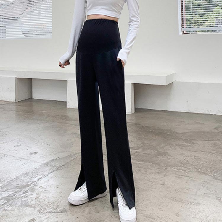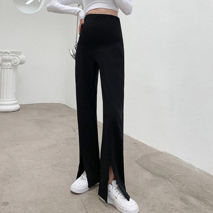 マタニティ パンツ ボトムス フレアパンツ スリット 産前 産後 妊婦服 ストレート レギンス お腹を包むウエスト ストレッチ アジャスター付き ルームウェア ワイド 黒 春 夏 秋 長ズボン 送料無料
